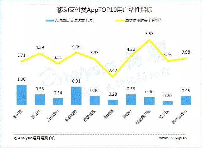另外,在榜单中值得关注的是银联钱包以及壹钱包。在线下收单市场占据绝对优势的银联,自今年上半年开始加大了在移动端的推广力度,在人均单日启动次数上逼近支付宝,达到了0.91次。