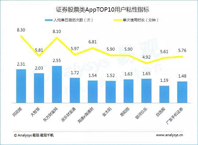 由于股票市场行情变动的特点,证券类应用的活跃度一般要高于其他应用,从用户粘性指标来看,人均单日启动次数最高的是东方财富网,达到了2.55次。同花顺和大智慧也超过了2次,这充分说明了其用户活跃程度较高。同花顺和东方财富网的细分领域挖掘较深,在单次使用时长指标上表现不俗。