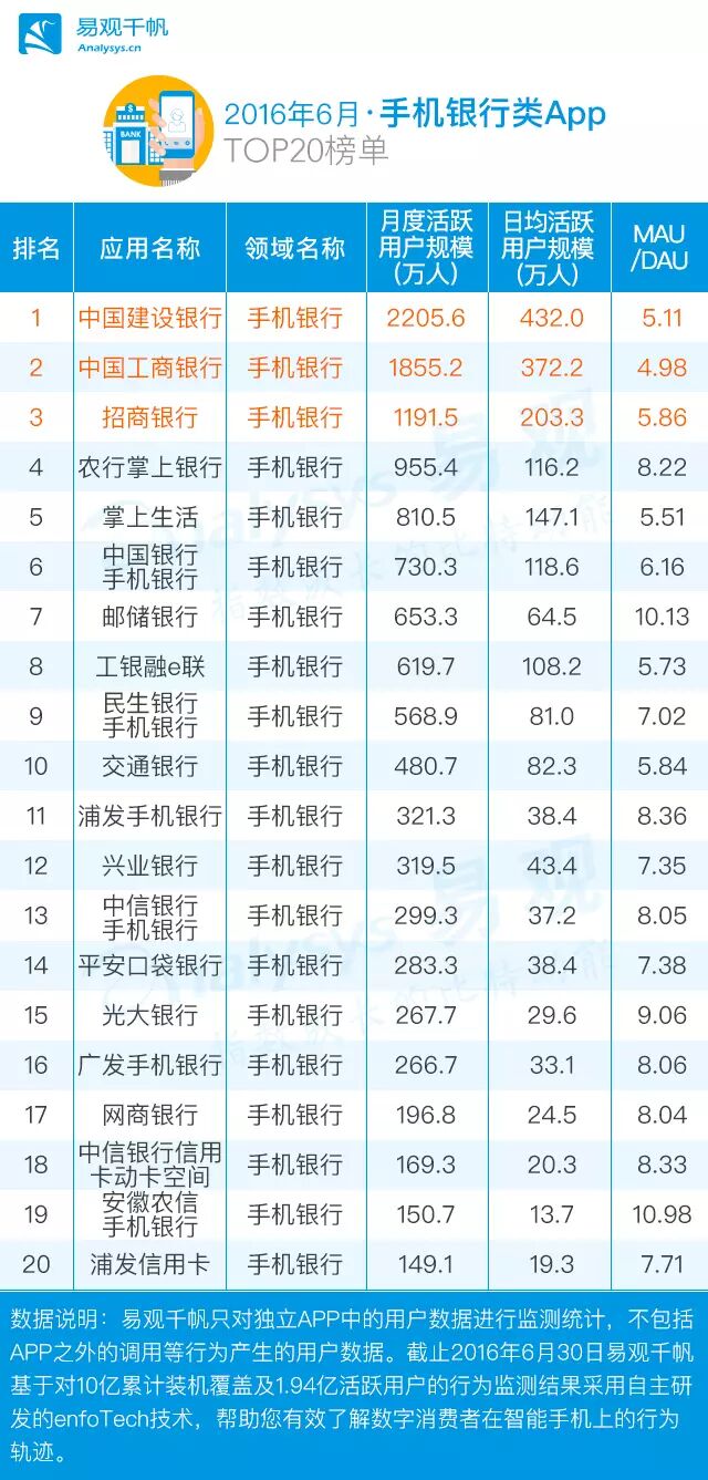 6月手机银行APP榜单中,中国建设银行、中国工商银行、招商银行以2205.6万、1855.2万、1191.5万的月活数分列前三甲,农行掌上银行紧随其后。