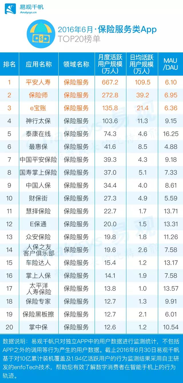 在6月的保险服务类应用榜单中,平安人寿以月度活跃667.2万人月度活跃用户规模的绝对优势排行首位,保险师和e宝账分别以272.8万和135.8万人的月活数分别排名第二、三位。