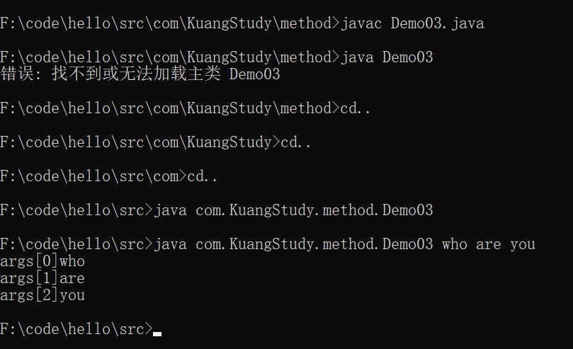 03此时文件目录应退到src下(根据包package的路径),再次输入java com.KuangStudy.method.Demo03