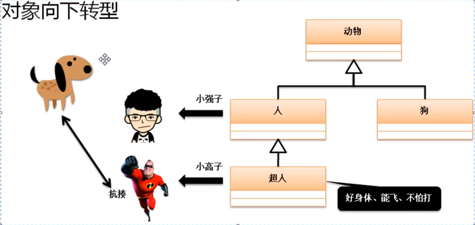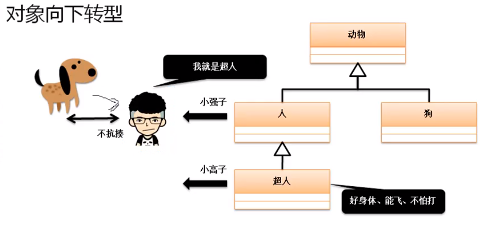 对象向下转型:子类 子类实例= (子类)父类实例;强制完成转换