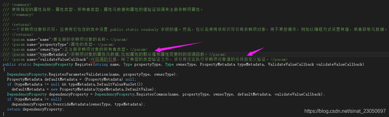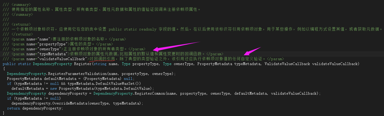 这两个方法都以DependencyProperty对象为参数,GetValue和SetValue两个方法分别通过DependencyProperty对象获取值和储存值,将DependencyObject和DependenctProperty紧密结合在一起。