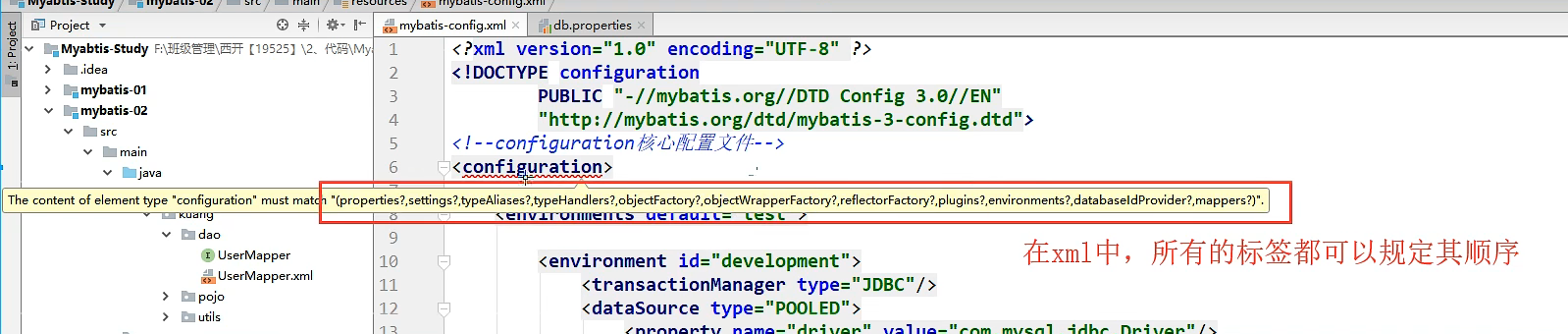 <?xml version="1.0" encoding="UTF-8" ?> <!DOCTYPE configuration PUBLIC "-//mybatis.org//DTD Config 3.0//EN" "http://mybatis.org/dtd/mybatis-3-config.dtd"> <!--configuration核心配置文件--> <configuration> <environments default="development"> <environment id="development"> <transactionManager type="JDBC"/> <dataSource type="POOLED"> <property name="driver" value="com.mysql.jdbc.Driver"/> <property name="url" value="jdbc:mysql://localhost:3306/mybatis?useUnicode=true&characterEncoding=utf8&useSSl=true&serverTimezone=GMT-8"/> <property name="username" value="root"/> <property name="password" value="123456"/> </dataSource> </environment> </environments> <mappers> <mapper class="com.xian.dao.UserMapper"></mapper> </mappers> </configuration>注意点,mapper映射中,class="com.xian.dao.UserMapper"