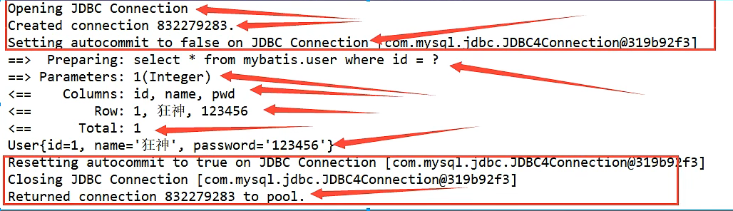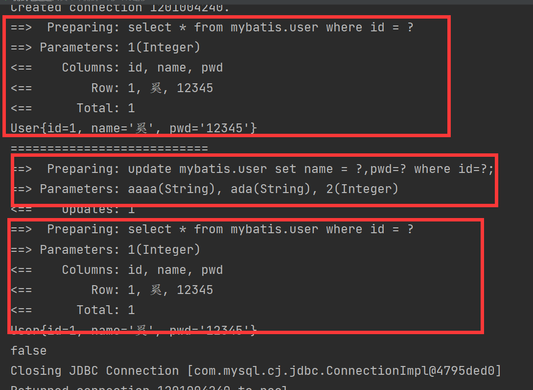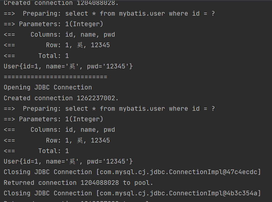 <select id="queryUsersByID" resultType="com.xian.pojo.User" parameterType="_int"> select * from mybatis.user where id = #{id} </select>@Test public void test(){ SqlSession sqlSession = myBatisUntil.getSqlSession(); UserMapper mapper = sqlSession.getMapper(UserMapper.class); User user = mapper.queryUsersByID(1); System.out.println(user); System.out.println("==========================="); User user2 = mapper.queryUsersByID(1); System.out.println(user2); System.out.println(user==user2); sqlSession.close(); } -
