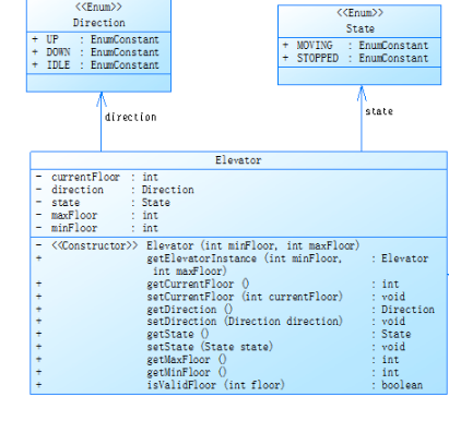 实现单一Elevator类,包含楼层状态、方向控制、内外请求队列