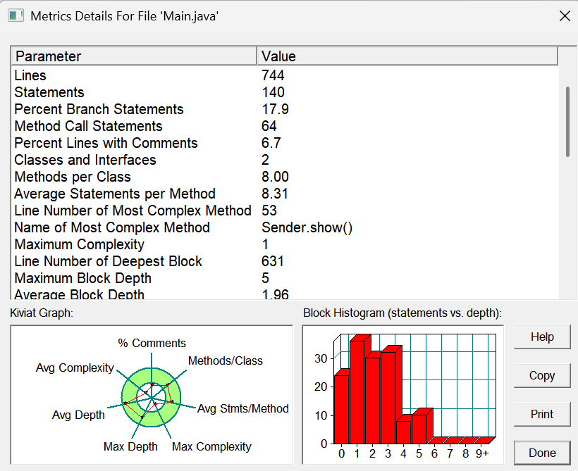 经 SourceMonitor 工具分析显示,该类存在与首次作业相同的代码质量问题: