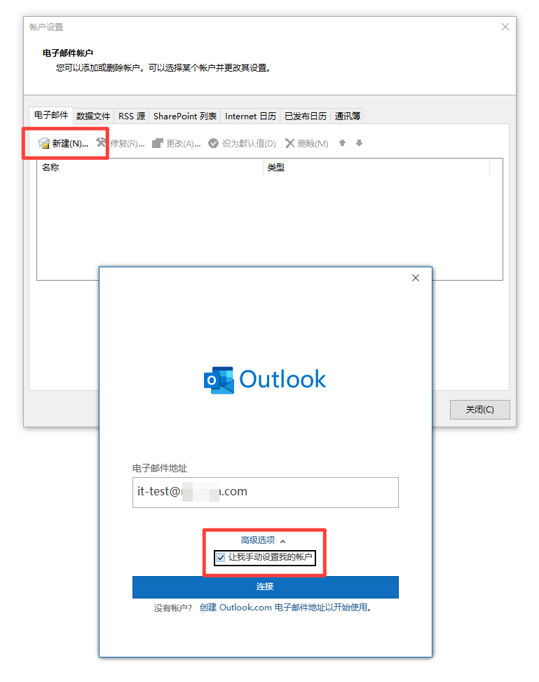 2、点击“新建”,填写邮箱账号,将“高级选项”中的“让我手动设置我的账户”勾上,然后点击“连接”