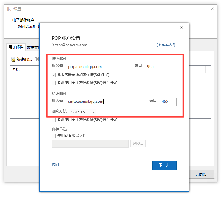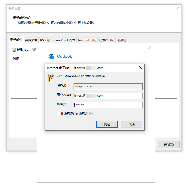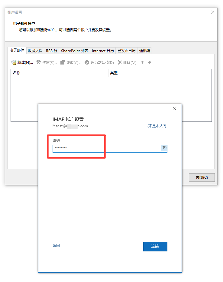 5、到这里一直弹输入密码框,密码绝对正确,不知道为啥,而且服务器也不让输入(腾讯企业邮箱服务器地址为 imap.exmail.qq.com 没办法我就用POP3协议了跳至第6步吧
