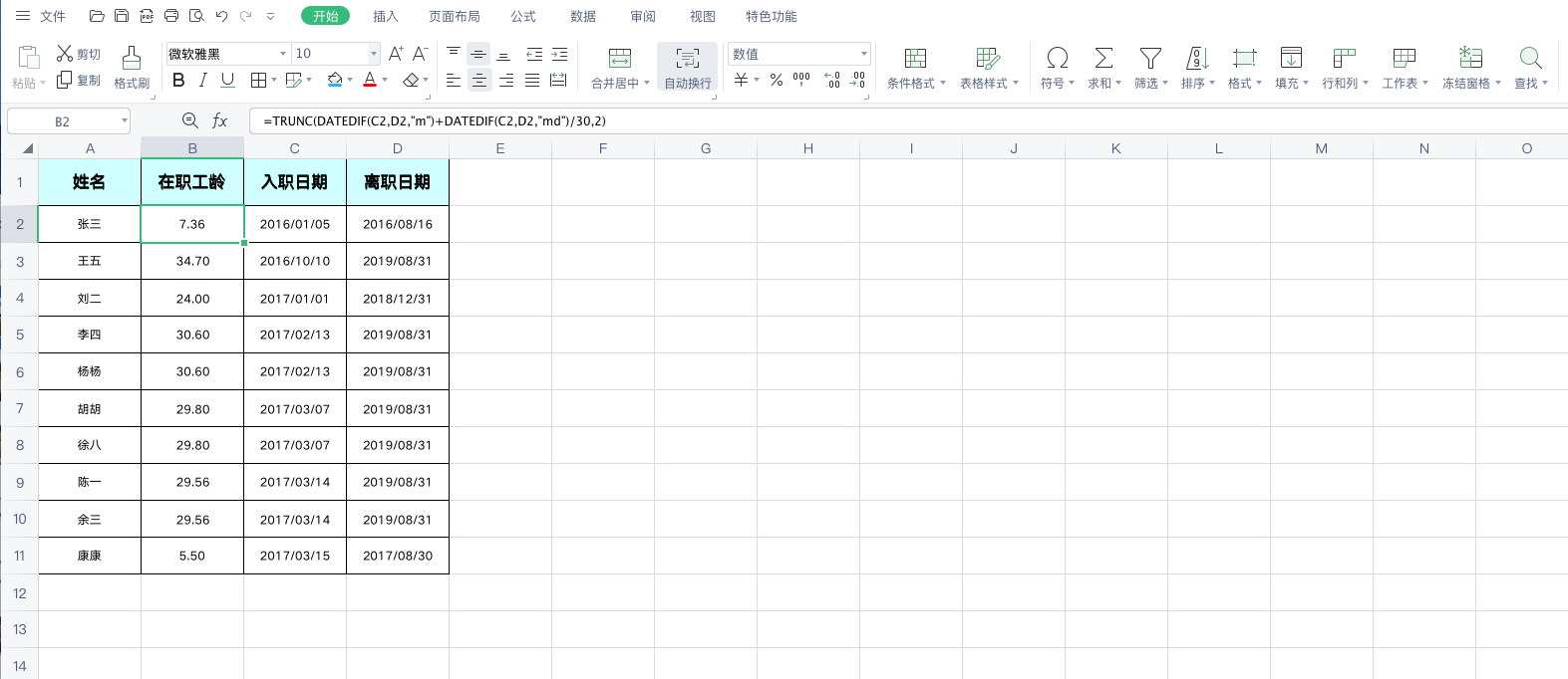 =TRUNC(DATEDIF(C2,D2,"m")+DATEDIF(C2,D2,"md")/30,2)