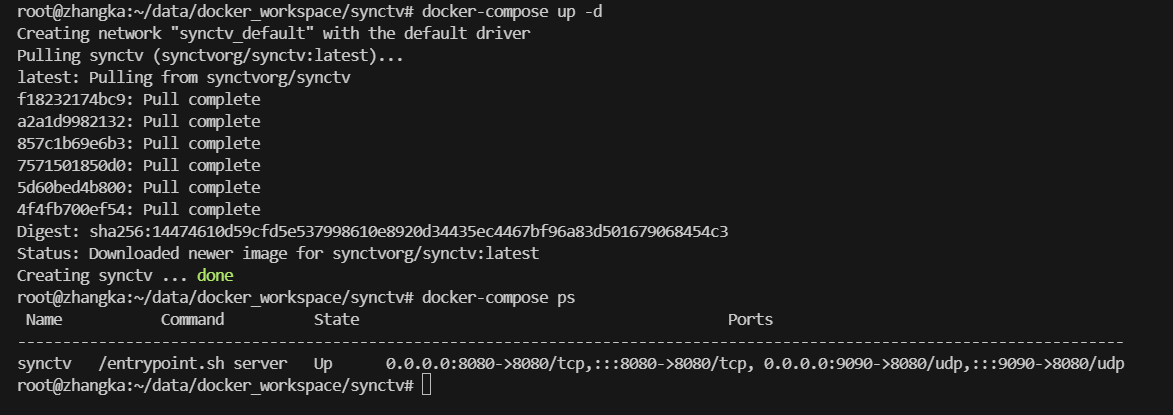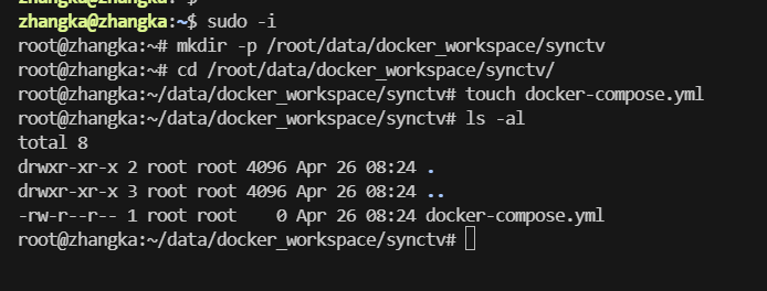 sudo -i #切换root用户 mkdir -p /root/data/docker_workspace/synctv #在root目录下递归创建文件夹 cd /root/data/docker_workspace/synctv #进入到synctv目录下 touch docker-compose.yml #创建一个docker-compose.yml配置文件