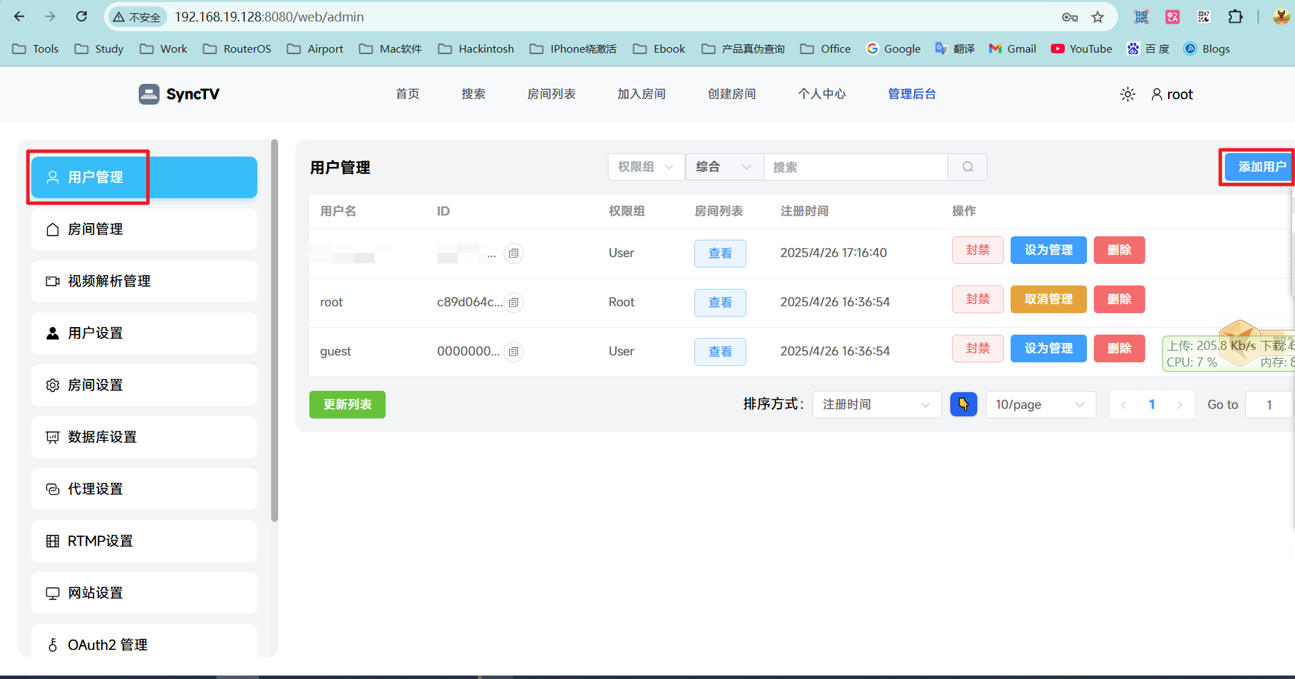 6、打开浏览器,地址栏输入 服务器ip:8080 进入后台管理,默认账号密码均为root