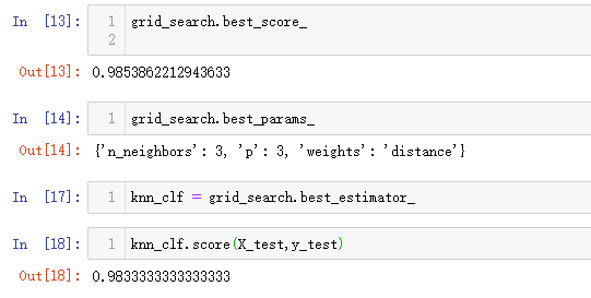 grid_search = GridSearchCV(knn_clf,param_research,verbose=2) 这个方法里面是有几个参数可以优化的。有个参数n_jobs,这个用来判断运行时有几个核进行工作,如果n_jobs=-1即默认电脑所有的核都进行工作;verbose值是程序运行时进行细节显示。