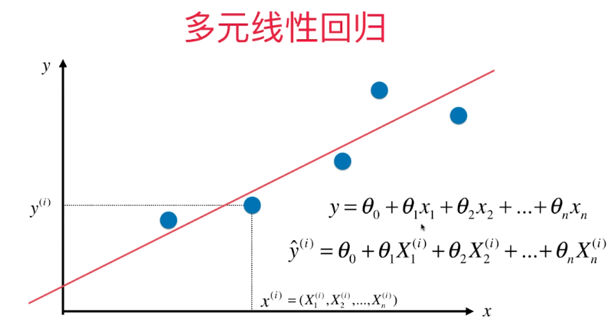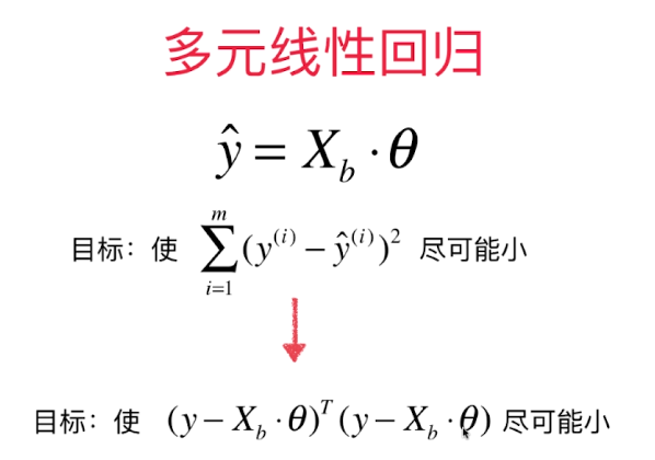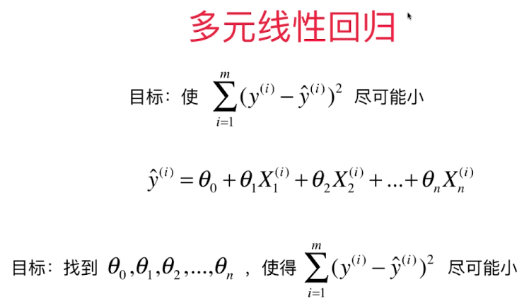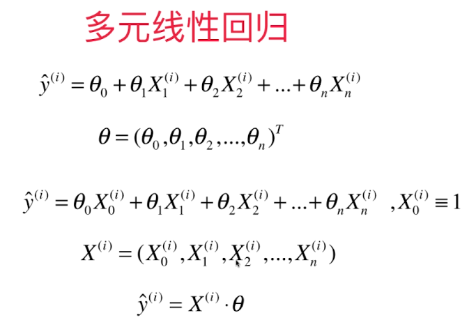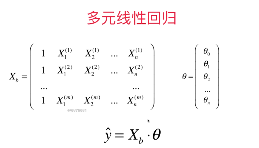 那么y_hat就可以写成上图的形式,算上截距在内,一共有n+1个需要预测的值。其实多元线性回归和简单线性回归是很类似的,只是预测值增加了。