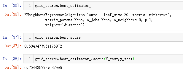 可以看出来最合适的p值是5,使用闵可夫斯基距离。调用best_score_查看此时的评价标准是0.63,但是此时的评价标准和线性回归的标准不是一个,这个评价都没有用到测试数据。