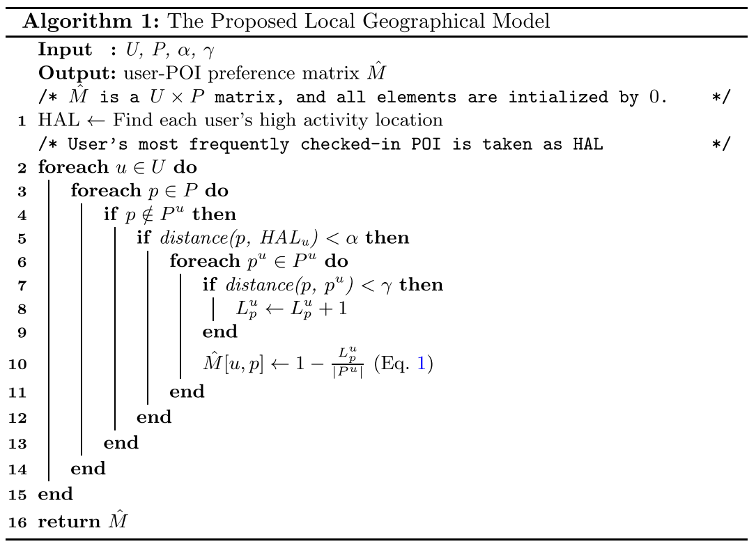 该算法由三个内循环组成,用于对地理信息进行建模,前两个循环对用户所在区域(第 2 - 5 行)进行建模,第三个循环计算考虑到对邻近 POI 的访问,用户更喜欢邻里内的 POI(第 6 - 10 行)。为了对用户的区域建模,我们需要找到每个用户的高活动位置(在现实世界中,这可能是用户的居住区域)。为此,用户最常签到的 POI 被用来推断他/她的高活动位置(第 1 行)。然后,我们扫描未访问的 POI 列表,以找到那些位于该用户的同一区域(区域内)内的 POI,即距离用户高活动位置(用户的角度)α 公里以内的那些(第 5 行)。此外,基于每个用户的区域内 POI,我们考虑签入的邻近 POI 的影响,这些 POI 与未访问的 POI 的距离小于 γ 米(位置的视角)(第 7-10 行)。