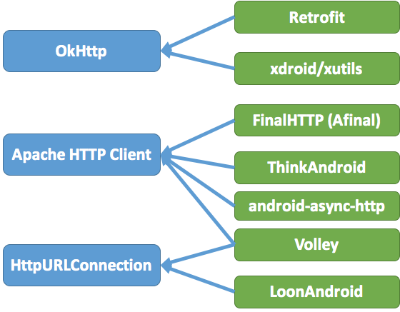 APP中常用的HTTP请求库有HttpURLConnection(HUC), Apache HTTP Client, OkHttp, Retrofit, Volley,还有一些“快速开发框架”(实际内部封装了这些库)。HUC是java.net.HttpURLConnection提供的功能,是Java自带的标准库,通常是第三方库用来请求HTTP的(这样就可以只依赖标准库)。Apache是曾经Android推荐的HTTP库,从5.0开始已经不再推荐,不过有一些老的三方库、控件库依然使用着Apache。OkHttp 是Square公司开发的方便好用的现代的HTTP请求库,目前使用非常流行,Retrofit也是依赖于OkHttp,OkHttp有2.x (包名com.squareup.okhttp), 3.x(包名okhttp3.*)两个版本,从5.0+开始,标准库的HUC实际内部实现是okhttp。最后Volley是Google官方出的一套小而巧的异步请求库,其实是个框架,底层可以对接其他HTTP库,官方提供了Apache和HttpURLConnection的支持。此外国内外有很多“所谓的HTTP库”其实都是对这几个库的封装。