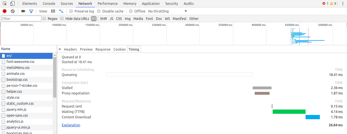 所以一个HTTP请求的耗时其实并不是一个整体,而是可以划分为多个阶段。以appetizer.io首页为例,利用Chrome开发者工具中的Network查看请求用时。