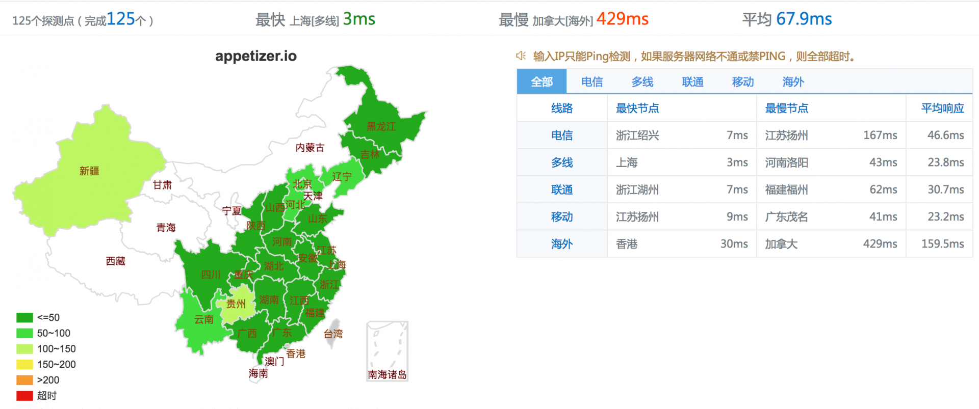 Latency 长主要是因为网络延时(服务器ping值)长或者服务器处理这个接口时间太久,以Appetizer官网为例,这个网站评测了不同地区对Appetizer服务器的ping值: