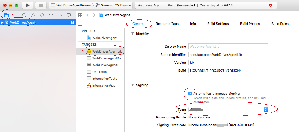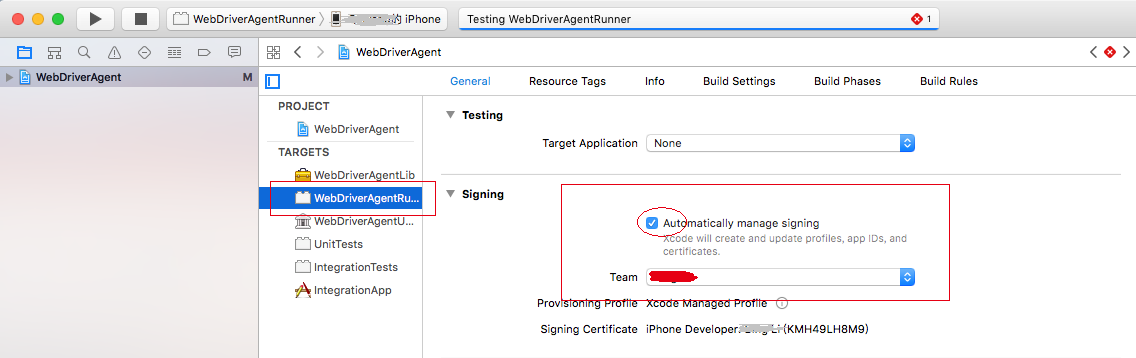 接着在TARGETS里面选中WebDriverAgentRunner,用同样的方法设置好证书