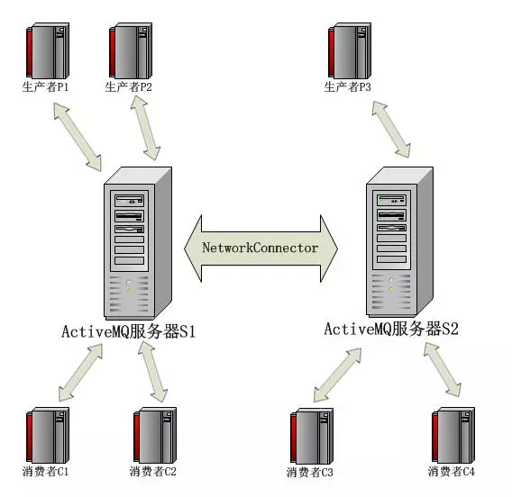 如图所示,服务器 S1 和 S2 通过 NewworkConnector 相连,生产者 P1 发送的消息,消费者 C3 和 C4 都可以接收到,而生产者 P3 发送的消息,消费者 C1 和 C2 也可以接收到。要使用网络连接器的功能需要在服务器 S1 的 activemq.xml 中的 broker 节点下添加如下配置(假设192.168.11.23:61617 为 S2 的地址):