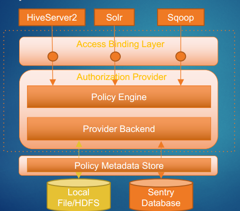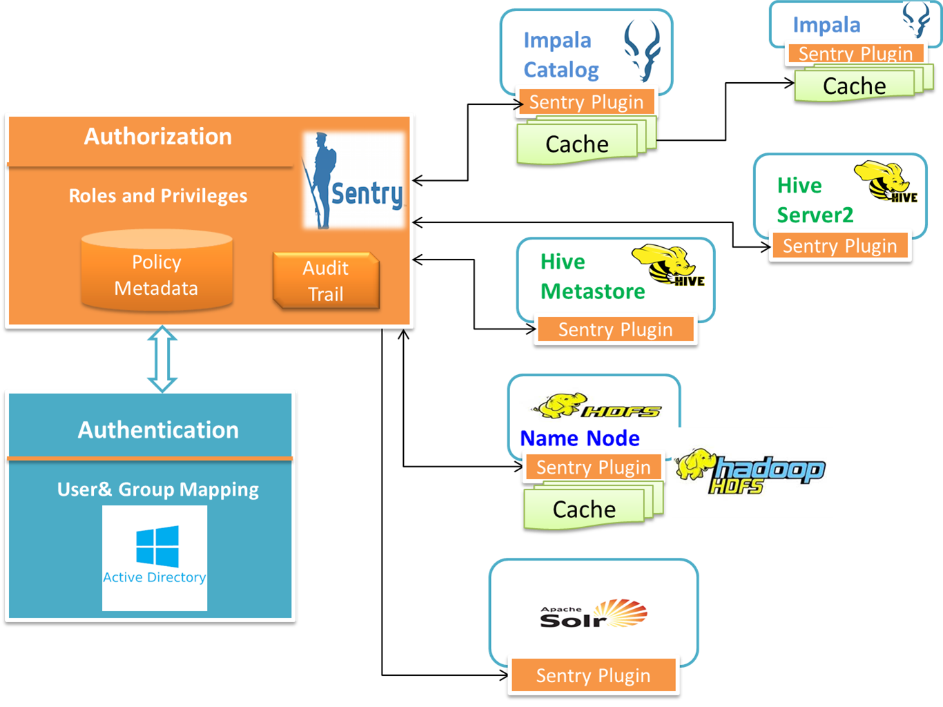 Sentry与Hive,HDFS,Impala等组件集成的较好, 结构图如下图所示: