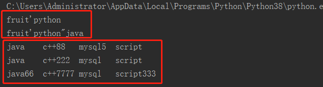 s1 = 'abc' s2 = "258" s3 = """ 98765 4321 """ # 需求:字符串中如果有单引号怎么定义? s4 = "fruit'python" # ---> 可以用双引号括起来 # 需求:字符串中如果有单引号和双引号怎么定义? s5 = """fruit'python"java""" # ---> 可以用三引号括起来 # 当然也可以使用更简便的方法:字符串转义 \ s6 = 'fruit\'python' print(s6) # 运行结果为fruit'python s7 = 'fruit\'python\"java' print(s7) # 运行结果为fruit'python"java # \t 水平制表符 s8 = "java\tc++88\tmysql5\tscript" s9 = "java\tc++222\tmysql\tscript" s10 = "java66\tc++7777\tmysql\tscript333" # 如果加\t\t,间隔会更宽一点,更加显得对齐好看 print(s8) print(s9) print(s10) # 关闭字符串转义,用r # file_path_1 = "C:\Users\Administrator\PycharmProjects\eg01\day_02\demo04_字符串.py" # print(file_path_1) # 报错,打印不出来 file_path_2 = r"C:\Users\Administrator\PycharmProjects\eg01\day_02\demo04_字符串.py" print(file_path_2) # 打印正确---> C:\Users\Administrator\PycharmProjects\eg01\day_02\demo04_字符串.py