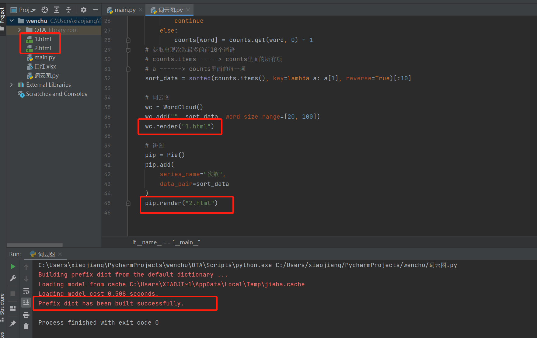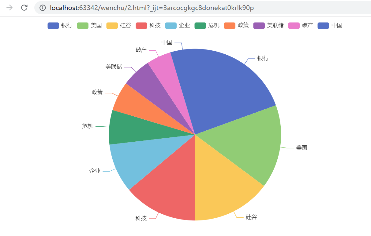 1 import jieba as jieba 2 import requests 3 from bs4 import BeautifulSoup 4 from pyecharts.charts import WordCloud, Pie 5 6 if __name__ == "__main__": 7 headers = { 8 "user-agent": "Mozilla/5.0 (Windows NT 10.0; Win64; x64) AppleWebKit/537.36 (KHTML, like Gecko) Chrome/111.0.0.0 Safari/537.36" 9 } 10 url="https://new.qq.com/rain/a/20230315A08LAK00" 11 res_html = requests.get(url, headers=headers).text 12 # print(res_html) 13 14 # 创建一个BeautifulSoup对象。对获取的网页进行过滤,获取其内容 15 soup = BeautifulSoup(res_html, "lxml") 16 # 获取文章的文字 17 txt = soup.select(".content-article")[0].text 18 # print(txt) 19 # 对文章进行分割 20 words = jieba.lcut(txt) 21 22 # 统计每个词语出现的次数 23 counts = {} 24 for word in words: 25 if len(word) == 1: 26 continue 27 else: 28 counts[word] = counts.get(word, 0) + 1 29 # 获取出现次数最多的前10个词语 30 # counts.items -----> counts里面的所有项 31 # a ------> counts里面的每一项 32 sort_data = sorted(counts.items(), key=lambda a: a[1], reverse=True)[:10] 33 34 # 词云图 35 wc = WordCloud() 36 wc.add("", sort_data, word_size_range=[20, 100]) 37 wc.render("1.html") 38 39 # 饼图 40 pip = Pie() 41 pip.add( 42 series_name="次数", 43 data_pair=sort_data 44 ) 45 pip.render("2.html")