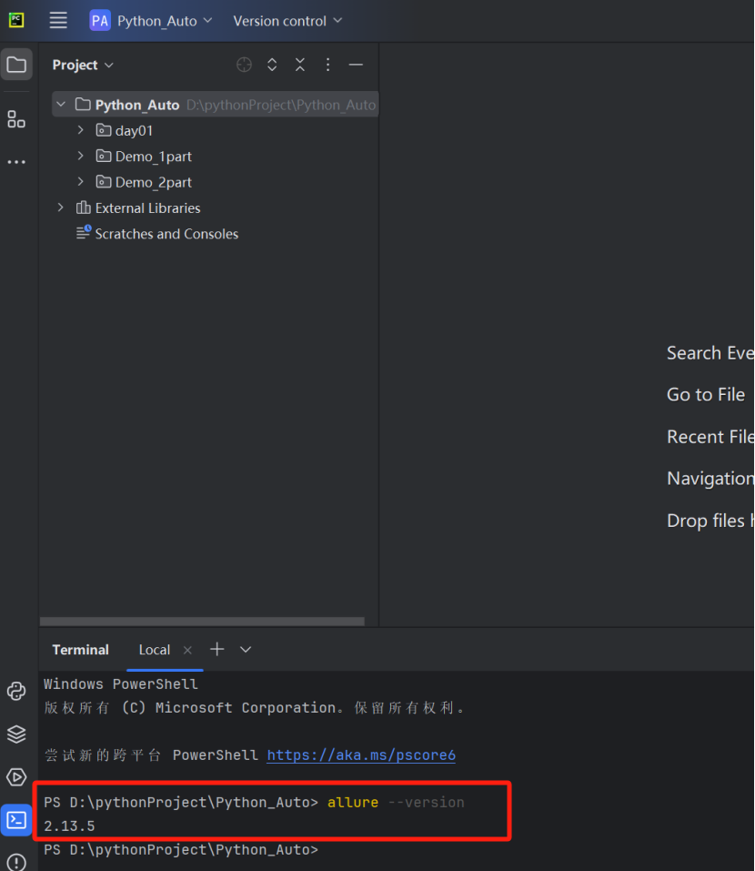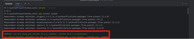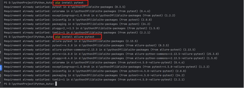 在pycharm中,终端,输入指令:pip install pytest和pip install allure-pytest。约等几分钟,即可安装完成。