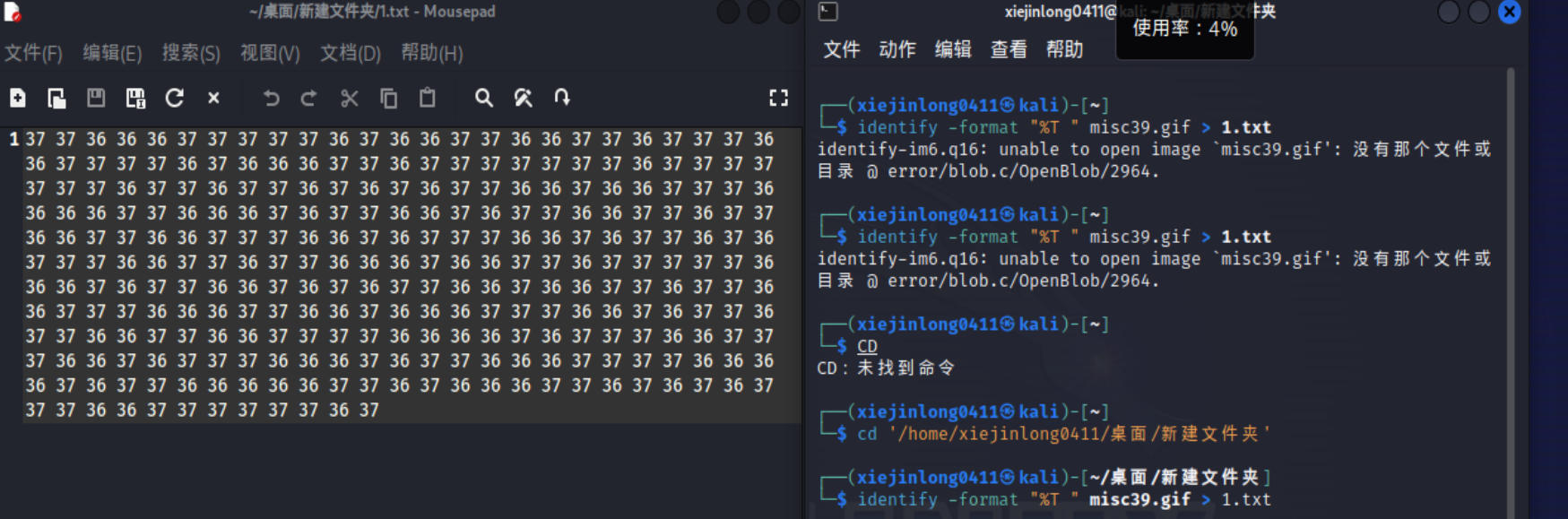 这里就需要用到虚拟机 里面的identify( gif 帧数间隔隐写)解开后一堆37,36将其换为1,0,flag 有 41 个字符,287/41 = 7 ,所以把每 7 位转一个字符,上脚本!