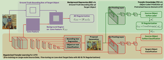 我们采用了一种新的正则化方法来增强微调,该方法由转移知识(TK)和背景抑制(BD)组成。TK将每个目标域的源-对象-标签知识转移到目标域,来概括在目标域的low-shot learning。BD将目标图像的边界框知识作为对特征图的额外监督,使LSTD在传输过程中对目标进行聚焦时,抑制背景干扰。