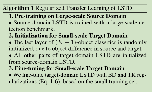 图二 LSTD正则化迁移学习。我们使用large-scale resource数据集来训练源域LSTD,同时使用预训练源域LSTD来初始化目标域LSTD,最后我们提出low-short目标正则化并使用小尺度目标来微调目标域LSTD。