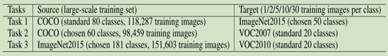 Date set : 由于我们的LSTD是一个基于正则化转移学习框架的低概率检测器,所以我们采用了一组检测基准数据集 coco,voc2007和VOC2010来作为源域和目标域如表1所示。训练集在每个任务的源域中是大规模的,而在目标域中是low-shot的(1/2/5/10/30每个目标对象类的训练图像)。此外,为了评估我们的LSTD是否能够从目标域中的少量训练镜头中检测到未被发现的目标类别,我们仔细选择了源和目标的目标分类,使其不重叠。最后,我们使用PASCAL VOC测试集的标准测试规则来求IOU为0.5的平均检测精度。注意,task 1的目标域是ImageNet2015有50对象。因此,我们为这个目标域定义了一个测试集,在这个测试集中,我们在ImageNet2015的每个target-object类中随机采样100张图像。公平起见,该目标域中的训练和测试图像是不重叠的。task 2和task 3的目标域参照标准VOC2007 VOC2010。因此,我们使用标准测试集进行评估。
