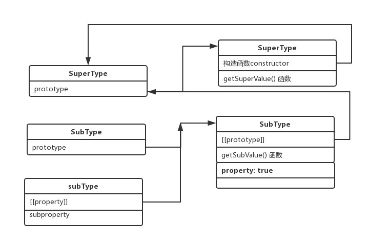 subType(new出来后的实例)指向SubType的原型,然而SubType由指向SuperType的原型。