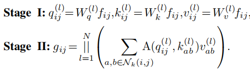 $\mathcal{N}_{k}(i,j)$表示空间范围k以(i,j)为中心的像素局部区域。$A$表示attention中的除以$\sqrt{d}$,然后计算softmax。