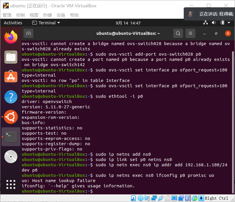 - 创建OVS交换机,并以ovs-switchxxx命名,其中xxx为本人在选课班级中的序号,例如ovs-switch001, ovs-switch088等。在创建的交换机上增加端口p0和p1,设置p0的端口号为100,p1的端口号为101,类型均为internal;为了避免网络接口上的地址和本机已有网络地址冲突,需要创建虚拟网络空间(参考命令netns)ns0和ns1,分别将p0和p1移入,并分别配置p0和p1端口的ip地址为190.168.0.100、192.168.0.101,子网掩码为255.255.255.0;最后测试p0和p1的连通性。