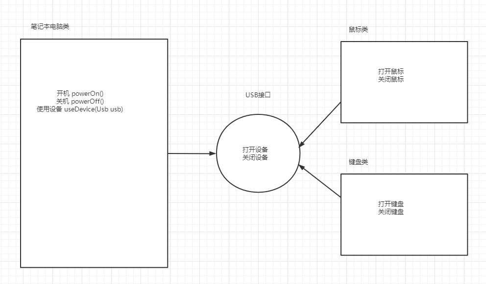 //测试类 public class DemoMain { public static void main(String[] args) { //首先创建一个笔记本电脑 Computer computer = new Computer(); computer.powerOn(); //准备一个鼠标,供电脑使用 Mouse mouse = new Mouse(); //首先向上转型 USB usbMouse = mouse; //参数是USB类型,传递的正好是USB鼠标 computer.useDevice(usbMouse); //创建一个USB键盘 Keyboard keyboard = new Keyboard(); computer.useDevice(keyboard); computer.powerOff(); } }