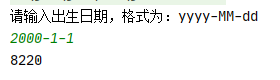 public static void main(String[] args) throws ParseException { //1、使用scanner类中的方法next,获取出生日期 Scanner sc = new Scanner(System.in); System.out.println("请输入出生日期,格式为:yyyy-MM-dd"); String next = sc.next(); //2、使用DateFormat英中的万法parse,把字符串的出生日期解析为Date格式 SimpleDateFormat dateFormat = new SimpleDateFormat("yyyy-MM-dd"); Date parse = dateFormat.parse(next); //3、把Dote格式的出生日期转换为毫秒值 long time = parse.getTime(); //4、获取当前的目期,转换为毫秒值 long time1 = new Date().getTime(); // 5、使用当前日期的毫秒值-出生自期的毫秒值 long l = time1 - time; //6、把毫秒值的差值转换为天(s/1000/60/60/24) System.out.println(l/1000/60/60/24); }