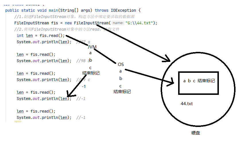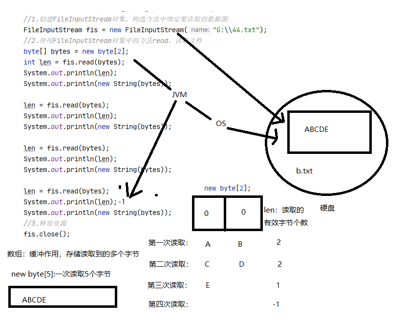 public static void main(String[] args) throws IOException { //1.创建FileInputStream对象,构造方法中绑定要读取的数据源 FileInputStream fis = new FileInputStream("G:\\44.txt"); //2.使用FileInputStream对象中的方法read,读取文件 byte[] bytes = new byte[2]; int len = fis.read(bytes); System.out.println(len);//2 System.out.println(new String(bytes));//AB len = fis.read(bytes); System.out.println(len);//2 System.out.println(new String(bytes));//CD len = fis.read(bytes); System.out.println(len);//1 System.out.println(new String(bytes));//ED len = fis.read(bytes); System.out.println(len);//-1 System.out.println(new String(bytes)); //3.释放资源 fis.close(); }