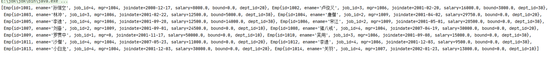 public static void main(String[] args) { List<Emp> list = findAll2(); System.out.println(list); } /** * 演示JDBC工具类 * @return */ public static List<Emp> findAll2(){ Connection conn = null; Statement stmt = null; ResultSet rs = null; List<Emp> list = null; try { // //1.注册驱动 // Class.forName("com.mysql.cj.jdbc.Driver"); // //2.获取连接 // conn = DriverManager.getConnection("jdbc:mysql:///db1", "root", "root"); conn = JDBCUtils.getConnection(); //3.定义sql String sql = "select * from emp"; //4.获取执行sql对象 stmt = conn.createStatement(); //5.执行sql rs = stmt.executeQuery(sql); //6.遍历结果集,封装对象,装载集合 Emp emp = null; list = new ArrayList<>(); while (rs.next()){ //获取数据 int id = rs.getInt("id"); String ename = rs.getString("ename"); int job_id = rs.getInt("job_id"); int mgr = rs.getInt("mgr"); Date joindate = rs.getDate("joindate"); double salary = rs.getDouble("salary"); double bouns = rs.getDouble("bonus"); int dept_id = rs.getInt("dept_id"); //创建Emp对象 emp = new Emp(id,ename,job_id,mgr,joindate,salary,bouns,dept_id); //装载集合 list.add(emp); } } catch (SQLException throwables) { throwables.printStackTrace(); }finally { JDBCUtils.close(rs,stmt,conn); } return list; }