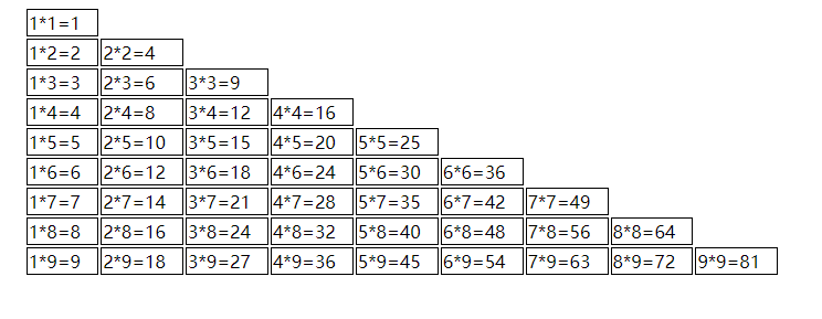 <!DOCTYPE html> <html lang="en"> <head> <meta charset="UTF-8"> <title>Title</title> <style> td { border: 1px solid } </style> <script> /* 99乘法表 */ document.write("<table align='center'>") for (var i = 1; i <= 9; i++) { document.write("<tr>") for (var j = 1; j <= i; j++) { document.write("<td>") document.write(j+"*"+i+"="+(i*j)+" "); document.write("</td>") } /*//输出换行 document.write("<br>");*/ document.write("</tr>") } document.write("</table>") </script> </head> <body> </body> </html>