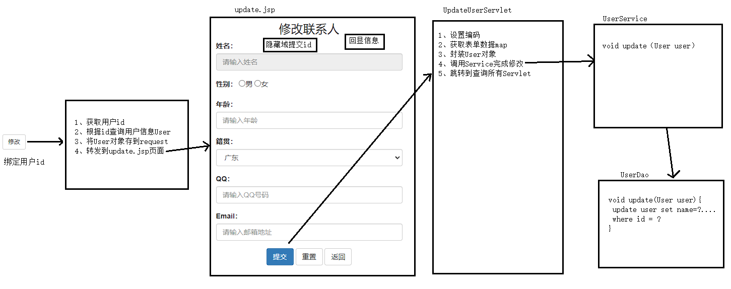 @Override public void update(User user) { //1、定义sql String sql = "update user set name = ?,gender = ?,age = ?,address = ?,qq = ?,email = ? where id = ?"; template.update(sql,user.getName(),user.getGender(),user.getAge(),user.getAddress(),user.getQq(),user.getEmail(),user.getId()); }