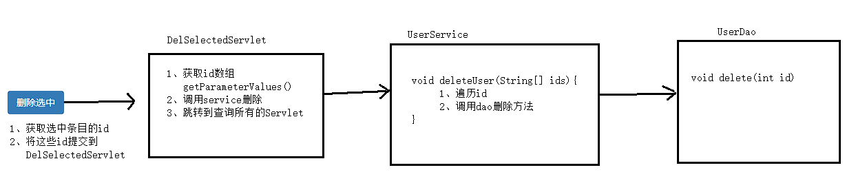 @Override public void delSelectedUser(String[] ids) { //1、遍历数组 for (String id : ids) { //2、调用删除 dao.delete(Integer.parseInt(id)); } }
