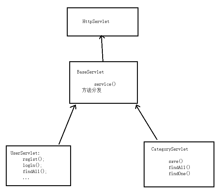 public class BaseServlet extends HttpServlet { @Override protected void service(HttpServletRequest req, HttpServletResponse resp) throws ServletException, IOException { //System.out.println("BaseServlet的service方法被执行"); //完成方法分发 //1、获取请求路径 String uri = req.getRequestURI(); System.out.println("请求的uri:"+uri); //2、获取方法名称 String methodName = uri.substring(uri.lastIndexOf("/") + 1); System.out.println("方法名称:"+methodName); //3、获取方法对象 try { Method method = this.getClass().getMethod(methodName, HttpServletRequest.class, HttpServletResponse.class); //4、执行方法 method.invoke(this,req,resp); } catch (NoSuchMethodException e) { e.printStackTrace(); } catch (IllegalAccessException e) { e.printStackTrace(); } catch (InvocationTargetException e) { e.printStackTrace(); } } }