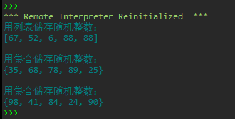import random print('用列表储存随机整数:') lst = [random.randint(0, 100) for i in range(5)] print(lst) print('\n用集合储存随机整数:') s1 = {random.randint(0, 100) for i in range(5)} print(s1) print('\n用集合储存随机整数:') s2 = set() while len(s2) < 5: s2.add(random.randint(0, 100)) print(s2)