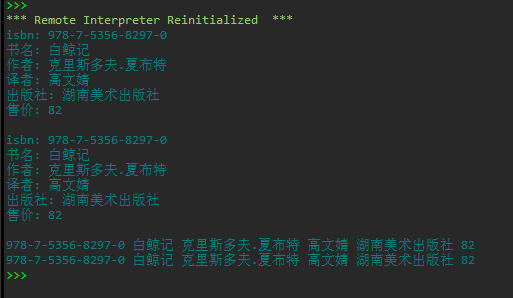 #字典遍历 book_info = {'isbn': '978-7-5356-8297-0', '书名': '白鲸记', '作者': '克里斯多夫.夏布特', '译者': '高文婧', '出版社': '湖南美术出版社', '售价': 82 } #遍历key-value对:实现方式1 for key, value in book_info.items(): print(f'{key}: {value}') print() #遍历key-value对:实现方式2 for item in book_info.items(): print(f'{item[0]}: {item[1]}') print() #遍历值: 实现方式1 for value in book_info.values(): print(value, end = ' ') print() #遍历值: 实现方式2 for key in book_info.keys(): print(book_info[key], end = ' ')