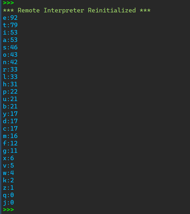 text1=''' The Zen of Python, by Tim Peters Beautiful is better than ugly. Explicit is better than implicit. Simple is better than complex. Complex is better than complicated. Flat is better than nested. Sparse is better than dense. Readability counts. Special cases aren't special enough to break the rules. Although practicality beats purity. Errors should never pass silently. Unless explicitly silenced. In the face of ambiguity, refuse the temptation to guess. There should be one-- and preferably only one --obvious way to do it. Although that way may not be obvious at first unless you're Dutch. Now is better than never. Although never is often better than *right* now. If the implementation is hard to explain, it's a bad idea. If the implementation is easy to explain, it may be a good idea. Namespaces are one honking great idea -- let's do more of those! ''' text=text1.lower() lst=[text.count(chr(i)) for i in range(97,97+26)] d={} for i in range(26): d.update({chr(i+97):lst[i]}) lst1=list(d.items()) lst2=[(i,j) for j,i in lst1] for i,j in sorted(lst2,reverse=True): print(f'{j}:{i}')