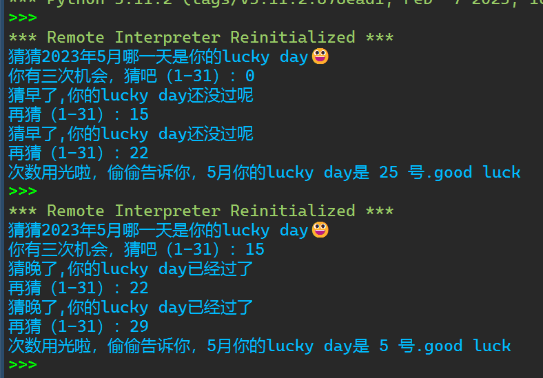 import random xO = random.randint(1,31) print('猜猜2023年5月哪一天是你的lucky day😀') x=int(input('你有三次机会,猜吧(1-31):')) if x == xO : print('哇,猜中了🤣') else: for i in range(2): if x>xO: print('猜晚了,你的lucky day已经过了') x = int(input('再猜(1-31):')) elif x<xO: print('猜早了,你的lucky day还没过呢') x = int(input('再猜(1-31):')) else: print('哇,猜中了🤣') break else: print('次数用光啦,偷偷告诉你,5月你的lucky day是',xO,'号.good luck')