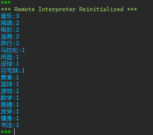 datas = {'2049777001': ['篮球', '羽毛球', '美食', '漫画'],