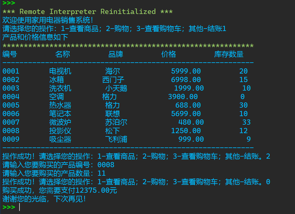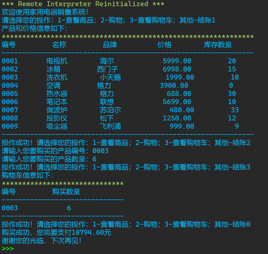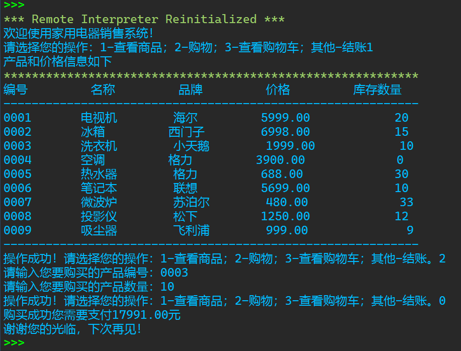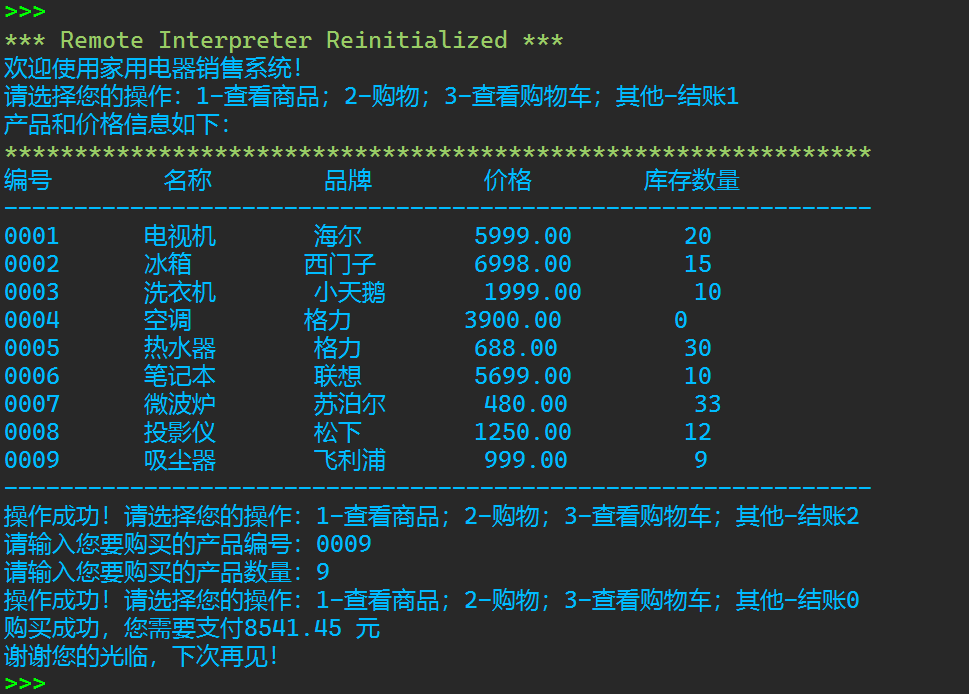 print('欢迎使用家用电器销售系统!') pro=[{'id':'0001','name':'电视机','brand':'海尔','price':5999.00,'count':20}, {'id':'0002','name':'冰箱','brand':'西门子','price':6998.00,'count':15}, {'id':'0003','name':'洗衣机','brand':'小天鹅','price':1999.00,'count':10}, {'id':'0004','name':'空调','brand':'格力','price':3900.00,'count':0}, {'id':'0005','name':'热水器','brand':'格力','price':688.00,'count':30}, {'id':'0006','name':'笔记本','brand':'联想','price':5699.00,'count':10}, {'id':'0007','name':'微波炉','brand':'苏泊尔','price':480.00,'count':33}, {'id':'0008','name':'投影仪','brand':'松下','price':1250.00,'count':12}, {'id':'0009','name':'吸尘器','brand':'飞利浦','price':999.00,'count':9} ] products_cart=[] option=input('请选择您的操作:1-查看商品;2-购物;3-查看购物车;其他-结账') while option in['1','2','3',]: if option=='1': print('产品和价格信息如下') print('***********************************************************') print('%-10s' % '编号', '%-10s' % '名称', '%-10s' % '品牌', '%-10s' % '价格', '%-10s' % '库存数量') print('-----------------------------------------------------------') for i in range(len(pro)): print('%-10s'%pro[i]['id'],'%-10s'%pro[i]['name'],'%-10s'%pro[i]['brand'],'%10.2f'%pro[i]['price'],'%10d'%pro[i]['count']) print('-----------------------------------------------------------') elif option == '2': pro_id = input('请输入您要购买的产品编号:') while pro_id not in [item['id'] for item in pro]: pro_id = input('编号不存在,请重新输入您要购买的产品编号:') count=int(input('请输入您要购买的产品数量:')) while count > pro[int(pro_id)-1]['count']: count=input('数量超出库存。请重新输入您要购买的产品数量:') if pro_id not in [item['id'] for item in products_cart]: products_cart.append({'id':pro_id,'count':count}) else: for i in range(len(products_cart)): if products_cart[i].get('id')==pro_id: products_cart[i]['count']+=count for i in range(len(pro)) : if pro[i]['id']==pro_id: pro[i]['count']-=count else: print('购物车信息如下:') print('************************************') print('%-10s'%'编号','%-10s'%'购买数量') print('------------------------------------') for i in range(len(products_cart)): print('%-10s'%products_cart[i]['id'],'%6d'%products_cart[i]['count']) print('------------------------------------') option = input('操作成功!请选择您的操作:1-查看商品;2-购物;3-查看购物车;其他-结账。') if len(products_cart)>0: amount=0 for i in range(len(products_cart)): pro_index=0 for j in range(len(pro)): if pro[j]['id']==products_cart[i]['id']: pro_index=j break price=pro[pro_index]['price'] count=products_cart[i]['count'] amount+=price*count if 5000 < amount <= 10000: amount = amount * 0.95 elif 10000 < amount <= 20000: amount = amount * 0.9 elif 20000 < amount: amount = amount * 0.85 else: amount = amount * 1 print('购买成功,您需要支付%8.2f元' % amount) print('谢谢您的光临,下次再见!')